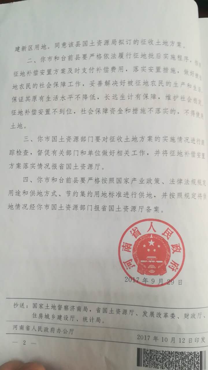 河南省人民政府关于台前县2017年度第一批城乡挂钩试点项目征收土地的批复